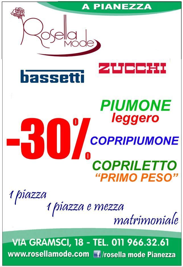 Rosella Mode offre servizi di altissima qualità e prodotti delle migliori marche presenti sul mercato per il settore abbigliamento e biancheria per la casa, pur conservando ogni giorno prezzi a buon mercato. Convenienza e qualità sono valori cardini per Rosella Mode, per questo vi propone offerte speciali, sconti vantaggiosi e promozioni tutto l'anno. Qualche esempio? Lenzuola, copriletti, spugne di Zucchi e Bassetti al 30% di su tutto l'assortimento oppure sconto del 33% acquistando tre capi d'abbigliamento assortiti per lui e lei della collezione Ragno. Venite a cogliere subito l'offerta che fa per voi e approfittate degli orari estivi di apertura: la merceria è aperta dal lunedì al sabato anche durante il mese di agosto ed eccezionalmente tutti i mercoledì di giugno e luglio fino alle ore 24.